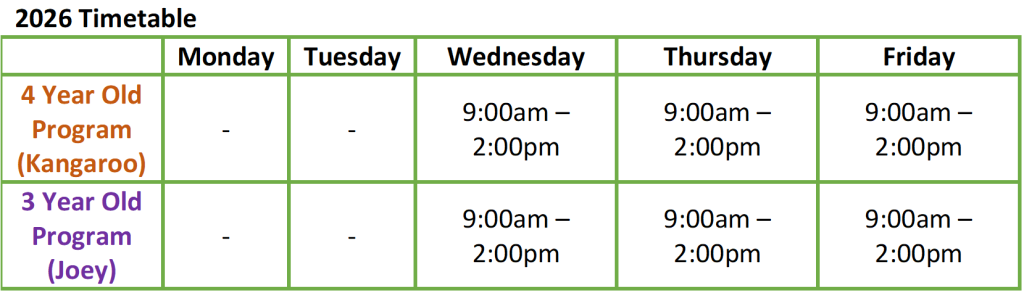 Our 4 year old program is 15 hours per week which runs from Wednesday to Friday each week during school terms.